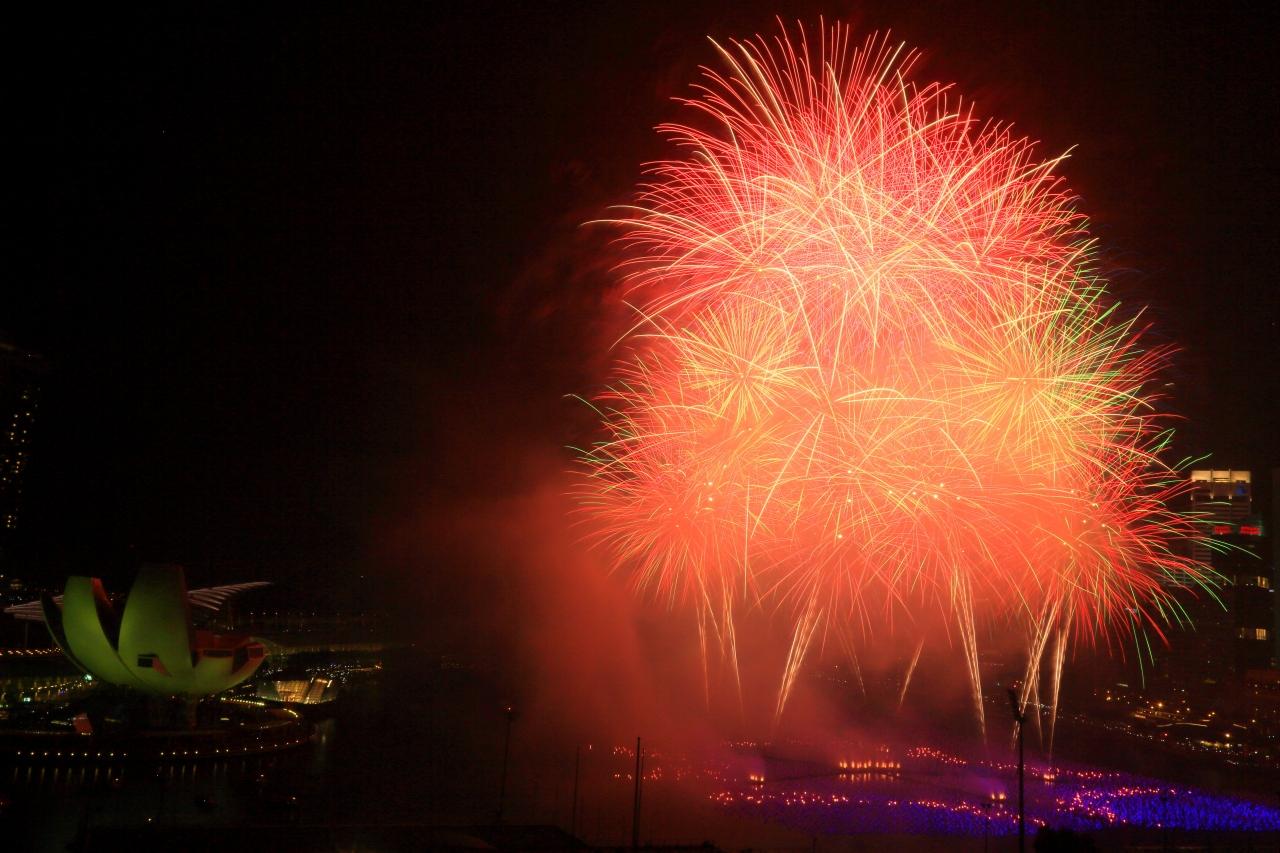 カウントダウンの花火が上がるという事は聞いていたのですが マリーナベイサンズの後ろから上がると勝手に予測していました。 -
