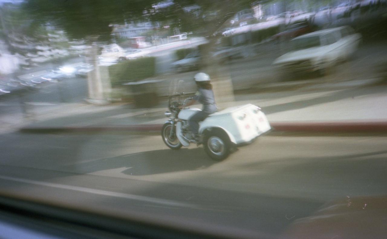 バスの中から見た三輪車。なんと女性のポリスでした。さすがロスは違うなあ、と思ったものです。