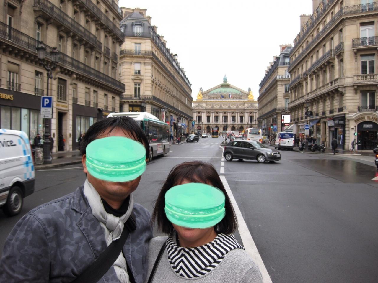 次は、エルメ前の道路から、遠くに見えるオペラ座をバックに記念撮影。