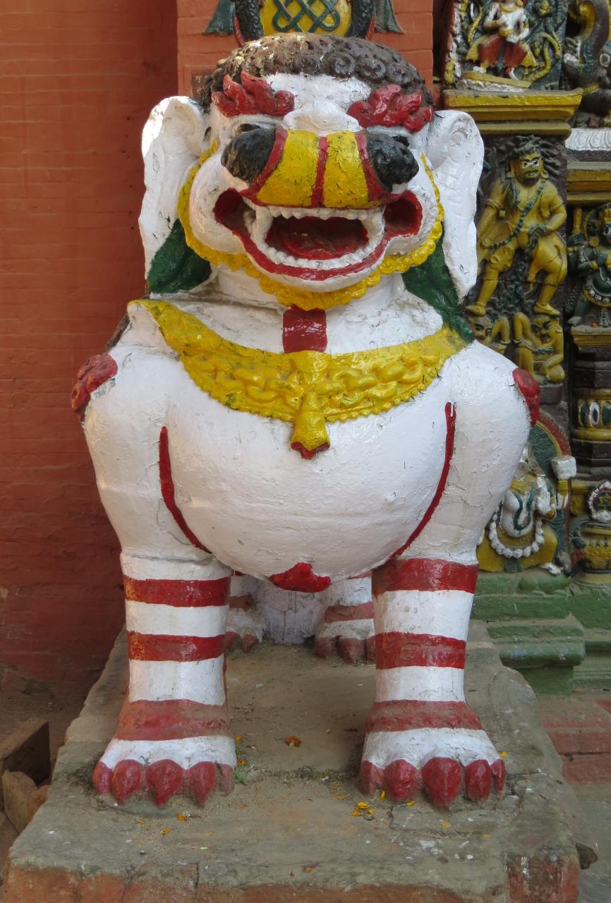 ハヌマーン門を守るカラフルな狛犬です。門に向かって右手の像です。日本の仏教の神様で例えれば、不動明王のような刀を持った神様が背中に乗っています。シヴァ神の化身でしょうか。密教の不動明王は、大日如来の化身とされます。(同上)