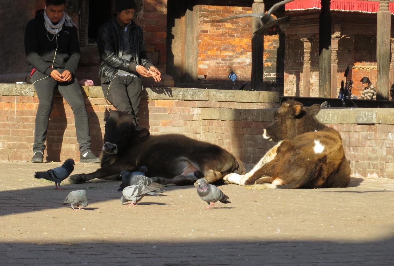寺院の境内に寝そべっていた、ヒンドゥ教の神様です。周りでは、忙しなく鳩さんが餌を探していました。(同上)