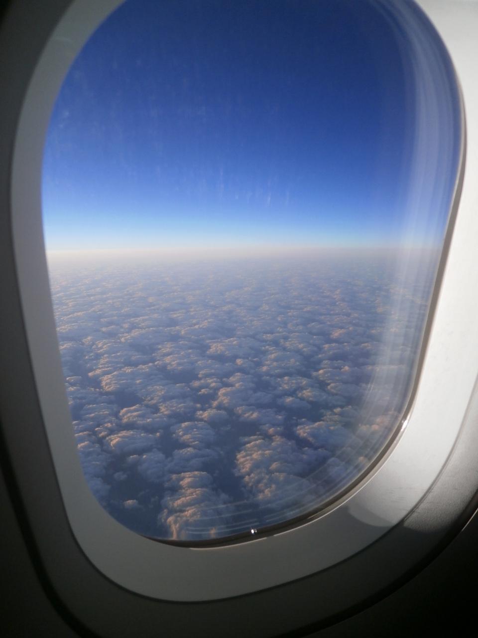 離陸後、シートベルト着用サインランプが切れたので、さっそく陽が昇る情景をカメラに収めました。 -