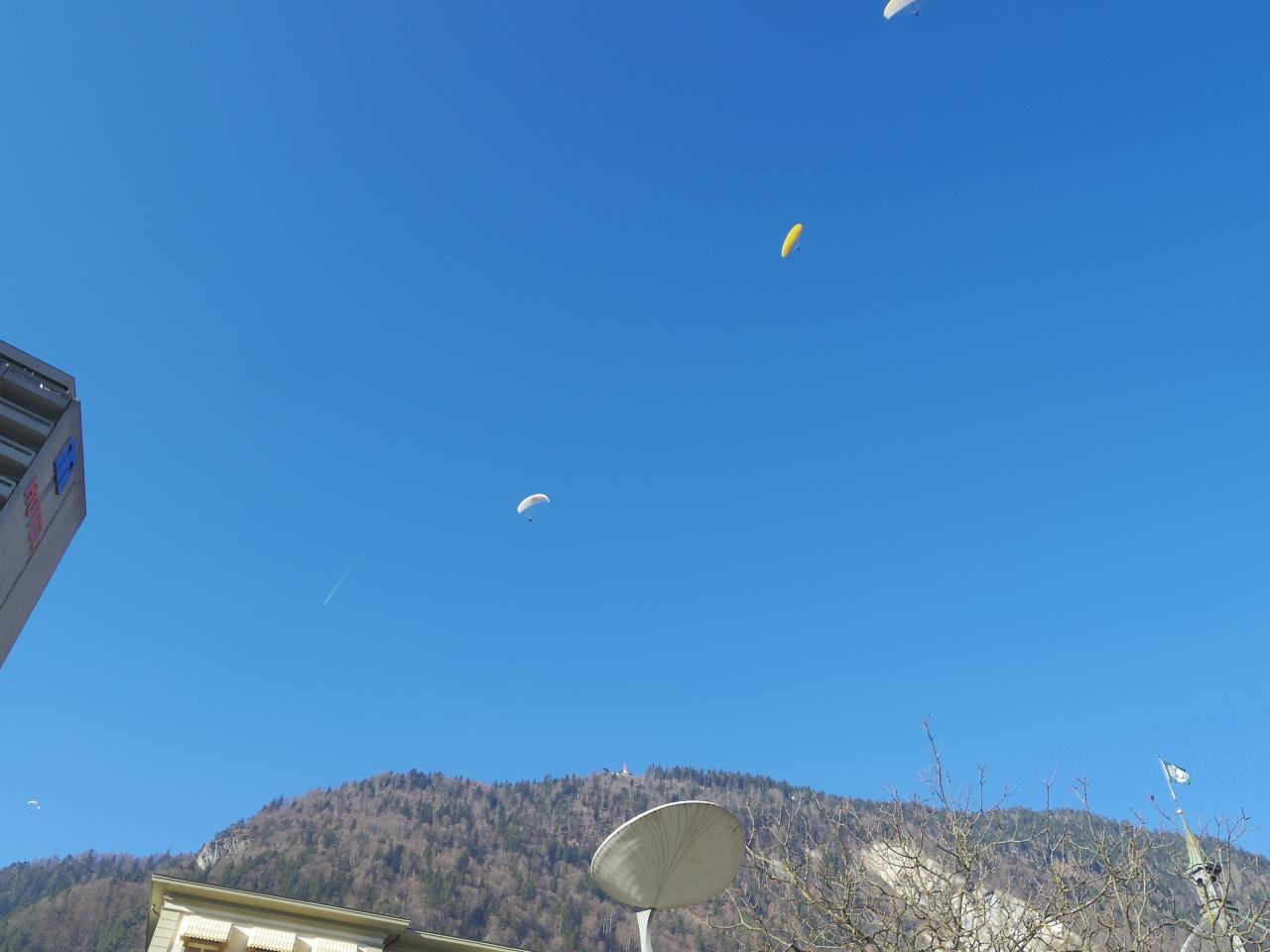 山の上にパラグライダーの離陸場所があるようで、いくつものパラグライダーが青空を漂っていました。そういえば、通りにパラグライダーの受付所があって、ワゴン車で山の上に行くみたいでした。