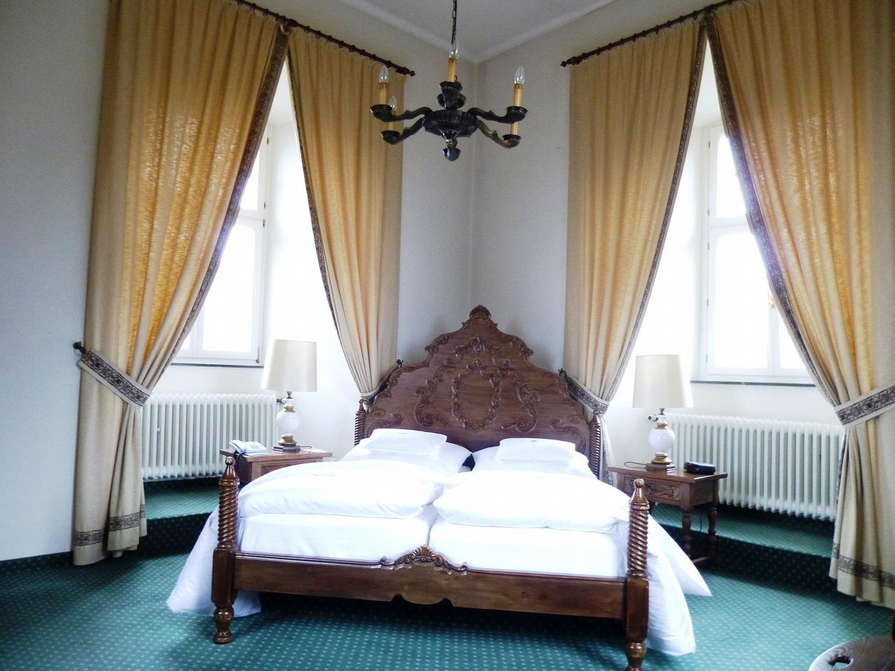 ホテルのスタッフに導かれて入った部屋は28号室。塔内にある部屋で、しかも螺旋階段で2階と3階が繋がっているのだ。後で外から見ると、古城の右手にある塔の1室であった。