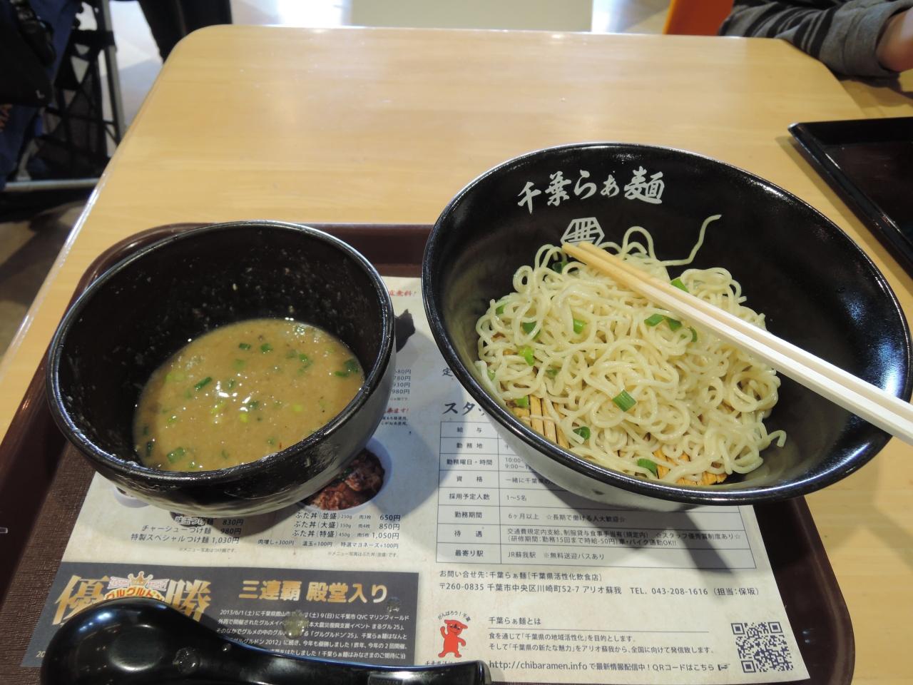 2月16日、アリオ蘇我のフードコートで珍しくランチをしました。本当は、豚骨ラーメンの一蘭に行く予定だったのですが、息子がうどんを食べたいというので、急遽変更。息子は丸亀製麺でうどんを食べましたが、私は、久しぶりに千葉らぁ麺でつけ麺を食べました。ここはフードコートの割に味がしっかりしていて、店舗店にも負けない味です。あっさり系とこってり系がありますが、あっさりは本当にあっさり味なので、濃厚魚介豚骨のこってり味にしました。もちろん麺は380gの大盛です。こってり味のつけだれは、スープと絡みますので、直ぐに無くなります。無料でつけだれ交換も良いですね。