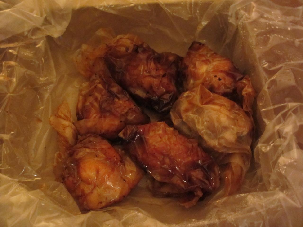 残念な事にレストランからホテルまでの移動時間が掛った事も有り、パラフィン紙とチキンがくっ付いてしまっています。