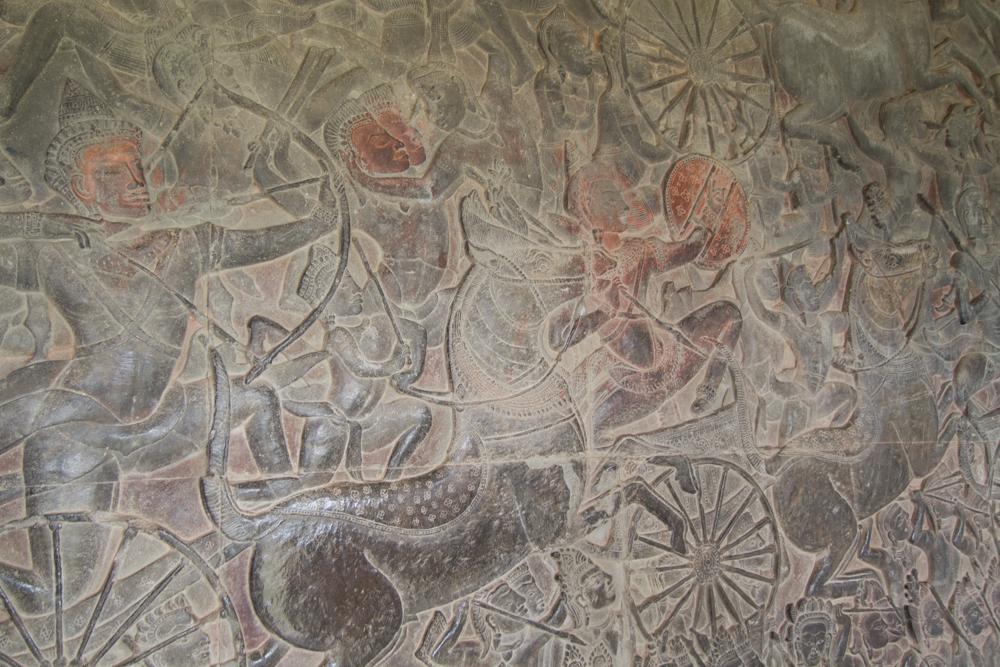 バイヨンには二重の回廊があり、外側の第一回廊がチャンパ族との戦いをメインに人々の生活を、内側の第二回廊がヒンドゥー神話や伝説をモチーフに巨大なレリーフが描かれています。