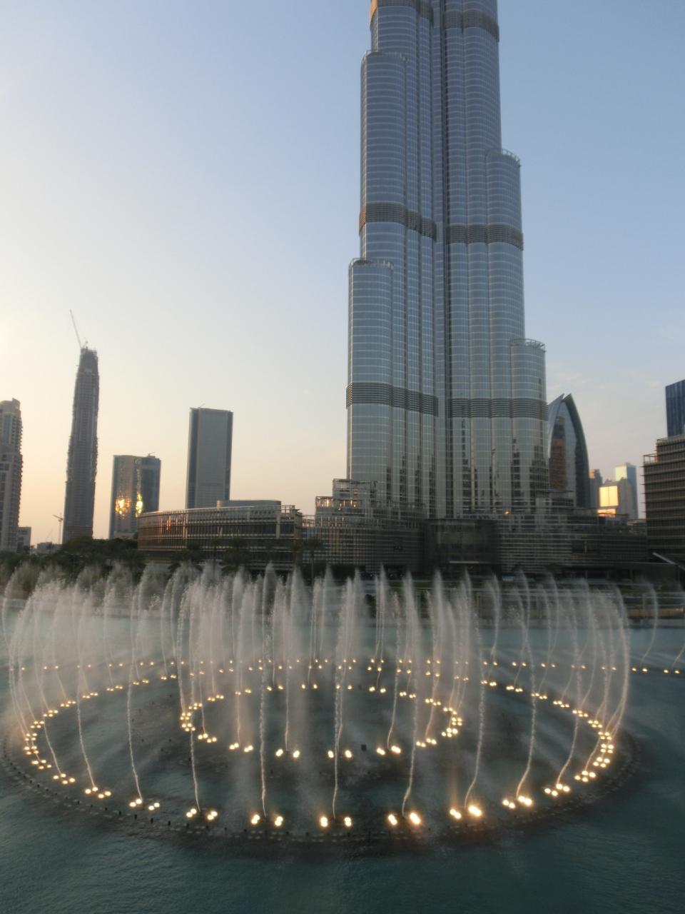 宿泊先ホテル「パレスダウンタウン」の門をくぐると、大きな池とブルジュ・ハリファがどどドーンと構えているっ!