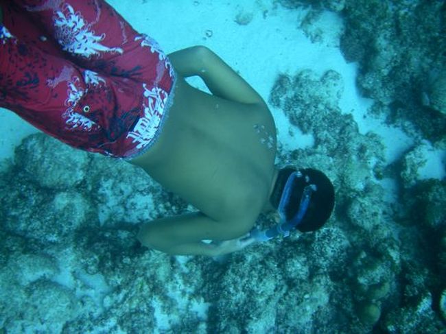 気を取り直してシュノーケルに出発! ウミガメを見るポイントなので、深すぎて珊瑚も魚も遠すぎてよく見えない..... -