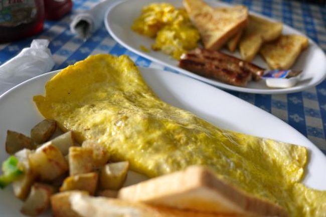 ガラパン付近の『ボビー・キャデラック』で朝ご飯。ハンバーガーとピザが美味しくて有名なお店なので、期待して入ったけど朝だからモーニングメニューしかなかった。二人でなるべく違うものを頼んだつもりだったのに、なんか似たような内容の料理が来た。