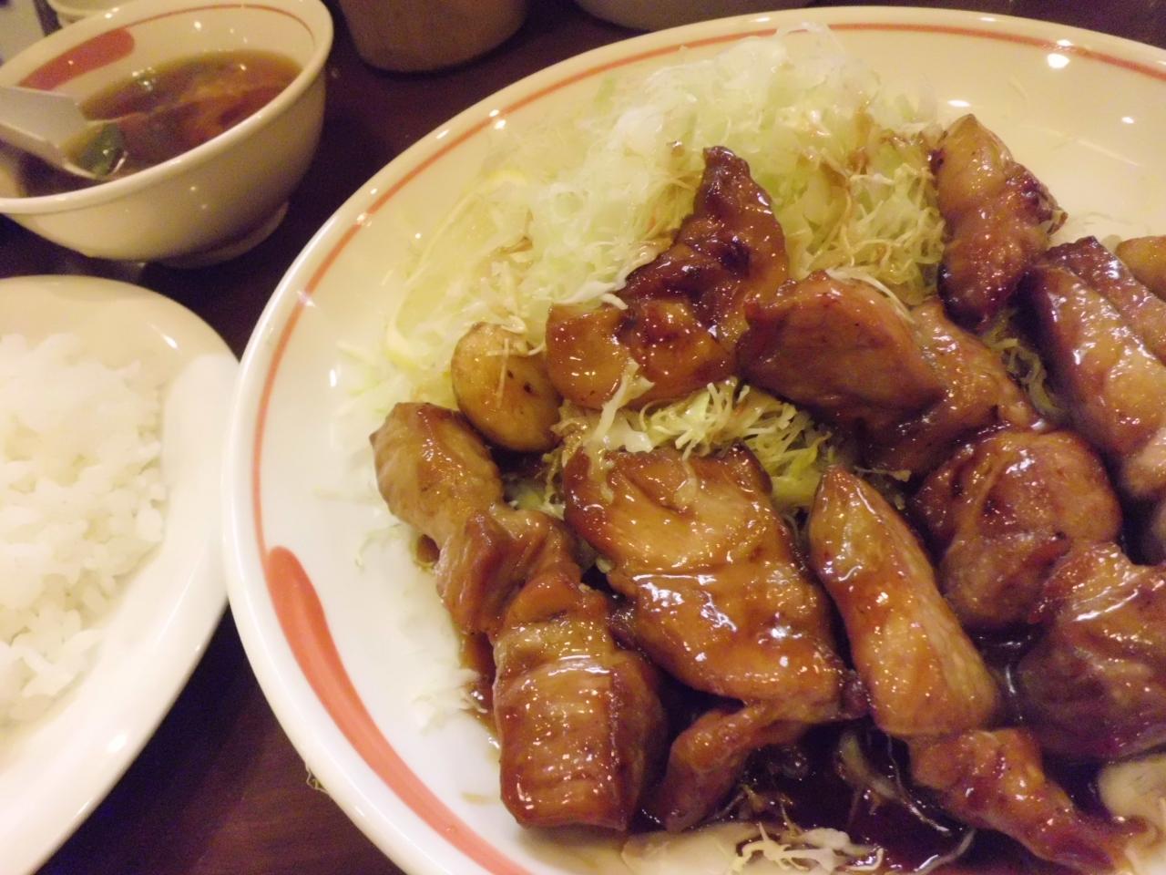 とんてき定食1312円。厚切りの豚肉を焼いて甘辛いタレで絡めてある。