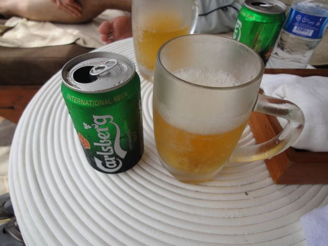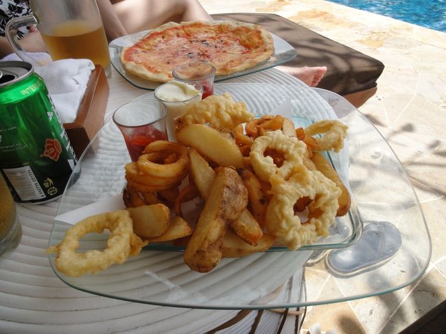 ランチは、プールサイドでピザとボテトフライにオニオンフライ、それにビールです。