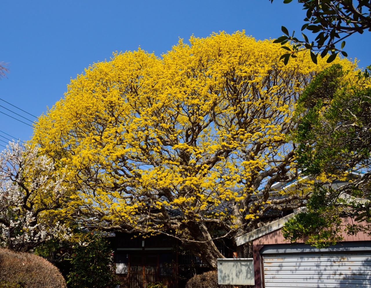 大泉橋を渡って八幡山方面に少し歩いたところにある民家の庭に巨大なサンシュユの木がある。家の屋根の高さと比べると、その巨大さがわかる。