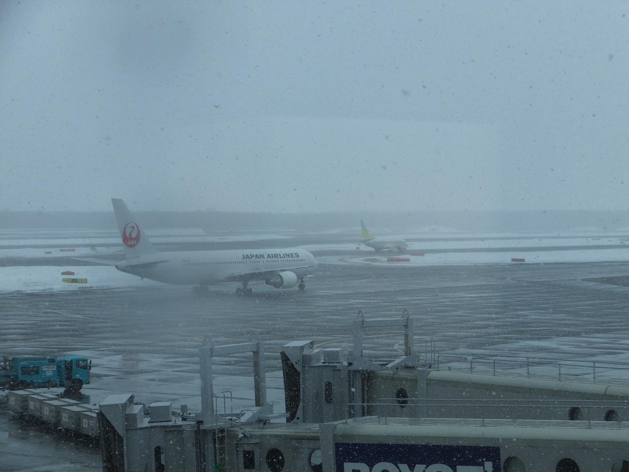 吹雪の中出発する便。
