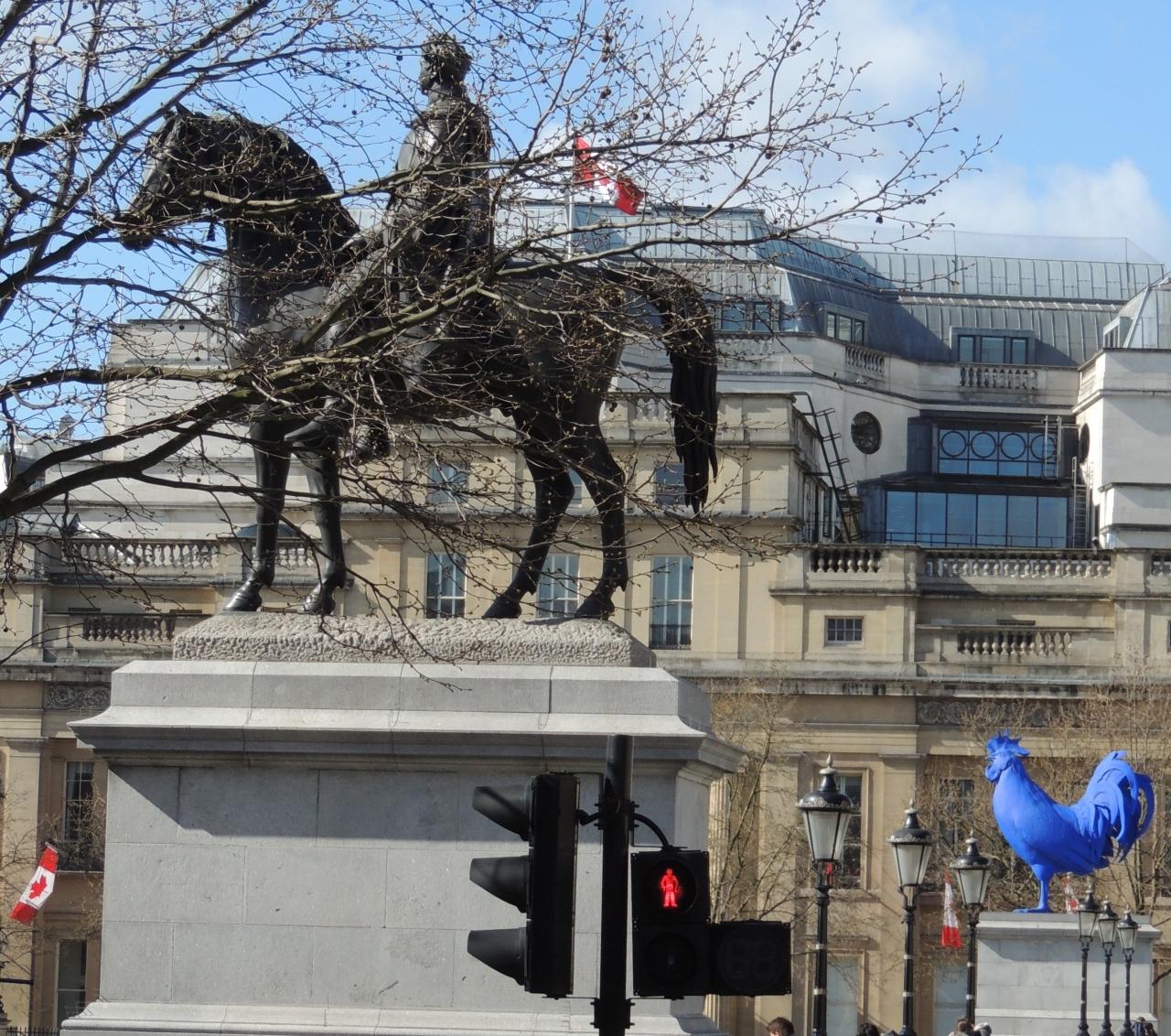 翌日は一日、Trafalgar Sqで過ごした。表紙写真の雄鶏が、こうしてジョージ4世の騎馬像と同格に並んでいるのが、英国式ジョーク。