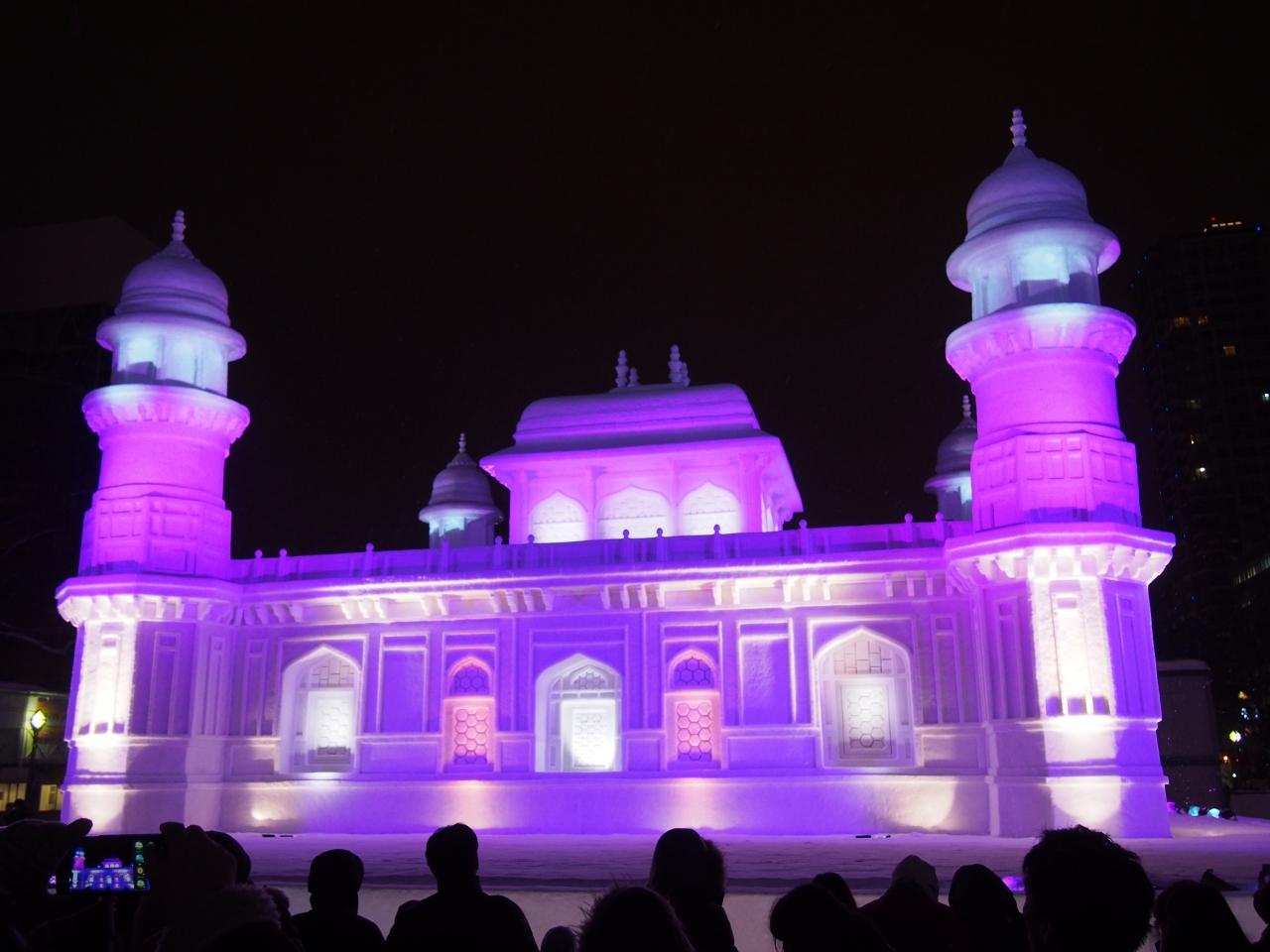昼も夜も雪像は雰囲気が違うので、たくさん撮影しました。