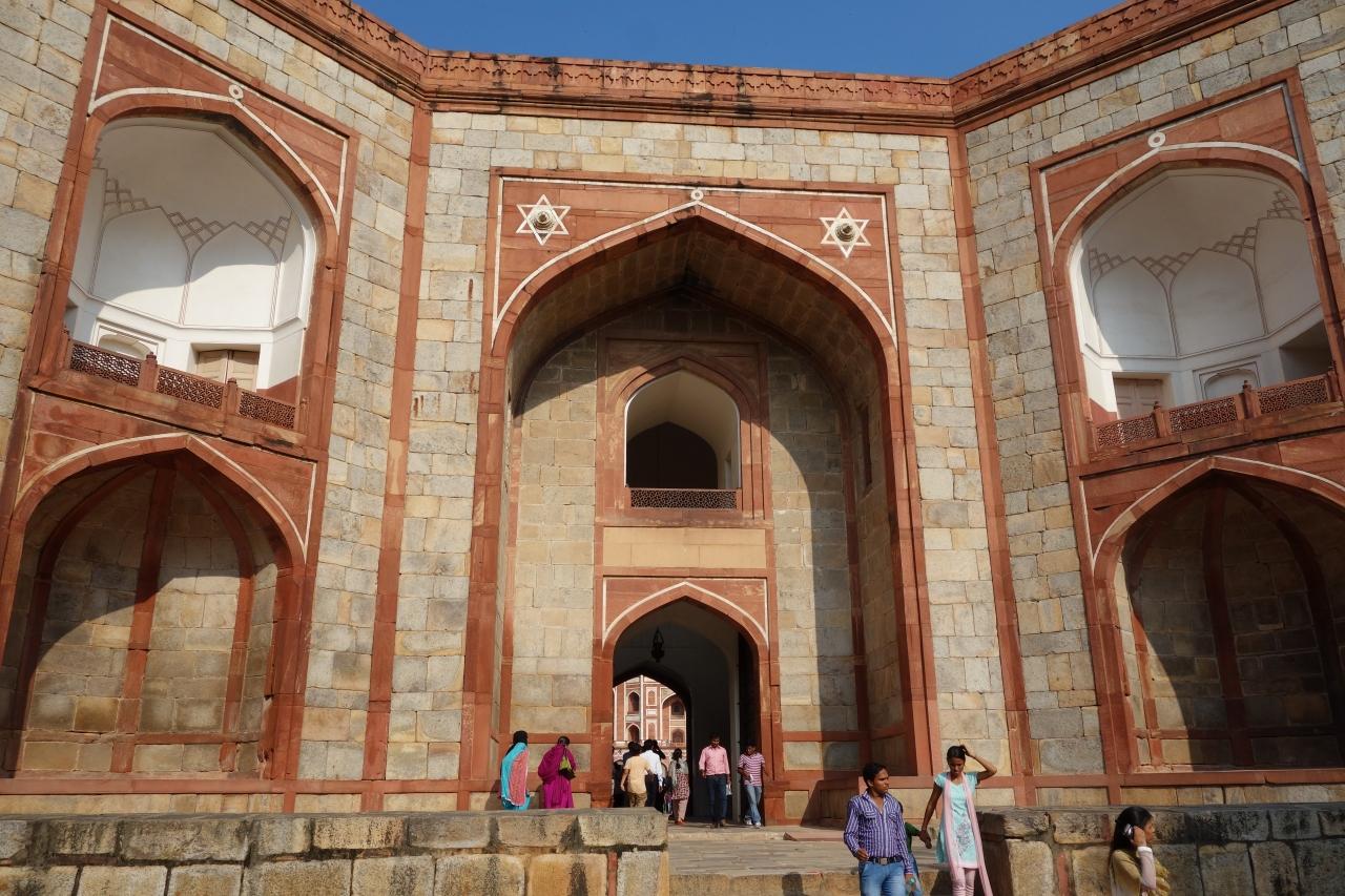 駐車場から歩いてフマユーン廟にたどり着く前に、他の廟を見ることができます。これは「イサ・カーン廟」(スール朝のシェール・シャーの宮廷に仕えた貴族イサ・カーンの廟)。門に隠れて見えず、ここを訪ねる時間がなかったので直接拝めませんでしたが、正八角形と純白のドームが美しいそうです。フマユーンの関係者が埋葬されているそうです。