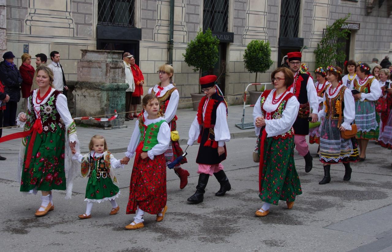 この聖体行列は、キリスト教の主要行事であるペンテコステ(イエス・キリストの復活を記念するイースターから数えて50日目の日)の後の2回目の木曜日に行われています。ミュンヘンの聖体行列は3キロにも及ぶ長いもので、参加する人はカトリックの教職者、騎士団のメンバー、大学の代表(学生)、市町村の代表、伝統的な民族衣装の団体、地域に居住する外国人のコミュティなど多岐に亘ります。2013年のモットーは、「信仰を共に歩む」というもので、近年若者の教会離れ、移民への反感など、キリスト教社会として深刻に受け止めなければならない状況を、反映したものなのかもしれません。何千人もの参加者が、静かに讃美歌を歌いながら歩く様は大変印象的でした。数百年ぶりという豪雨が続いていたため、実施が危ぶまれてやきもきしましたが、予定より遅れたものの、無事曇り空のもとで行われました。旅行では、建物や美術などの文化遺産を見るだけでも楽しいものですが、この聖体行列のような、地元の人々が参加する伝統的な行事を目にすることが出来たのは本当に幸いでした。2014年の聖体行列は6月19日だそうです。