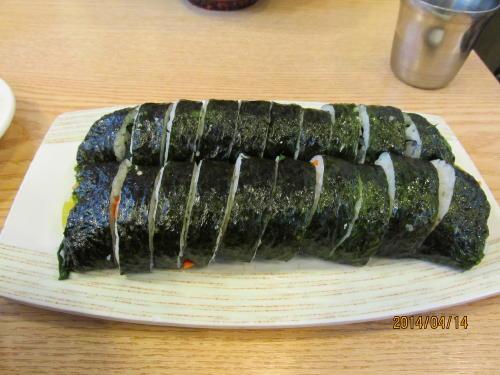 朝食はホテル近くの食堂でご存知「キンパップ」海苔巻きです。注文を受け、目の前で巻いてくれます。1500W