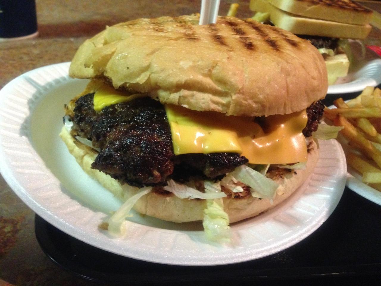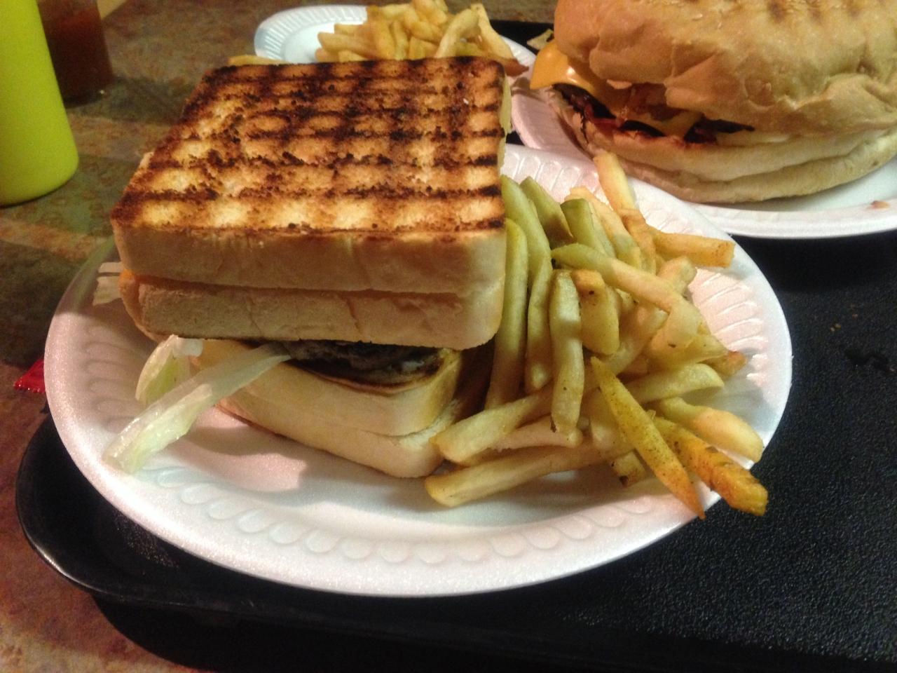 写真だと大きさが伝わらないけど、顔の大きさくらいある巨大なハンバーガー。メスクラ ドス (1号店) 地元の料理