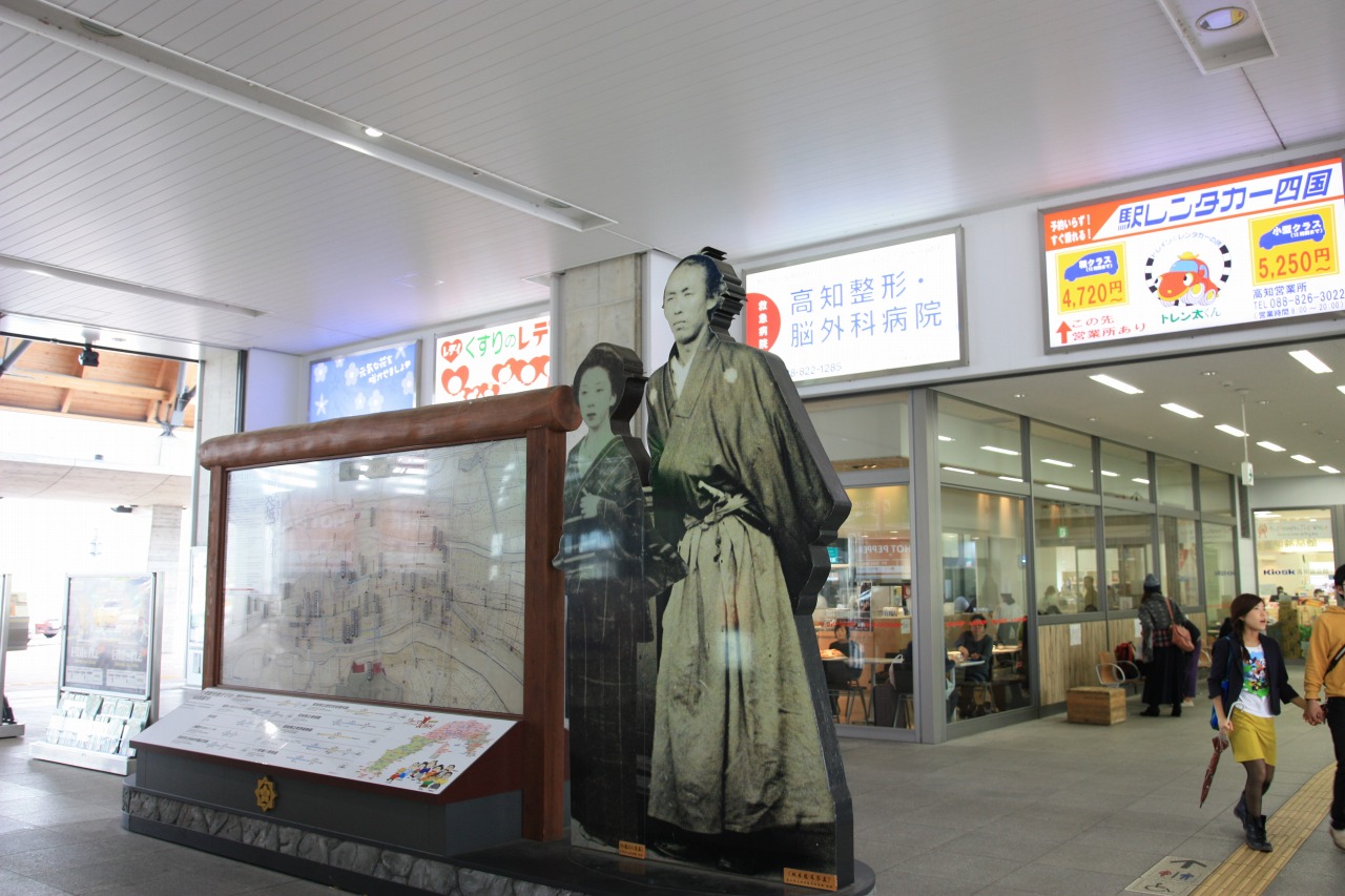 駅内では坂本龍馬とお龍がお出迎え。高知タウンを中心とした観光マップを見ることが出来る。