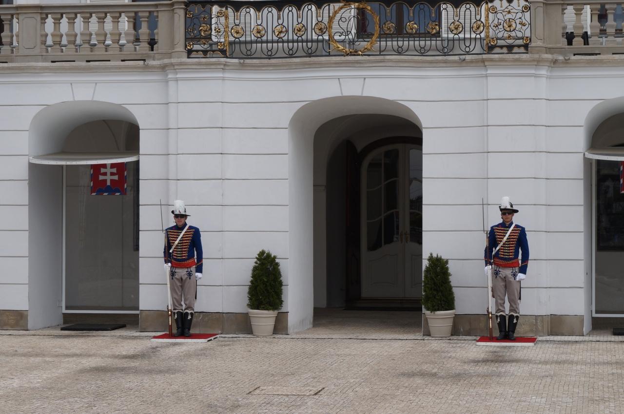 雨はやみましたが風があったのでスロバキアの旗がはためいていました。5本の国旗がはためいていました by HIDSYさん大統領官邸 建造物