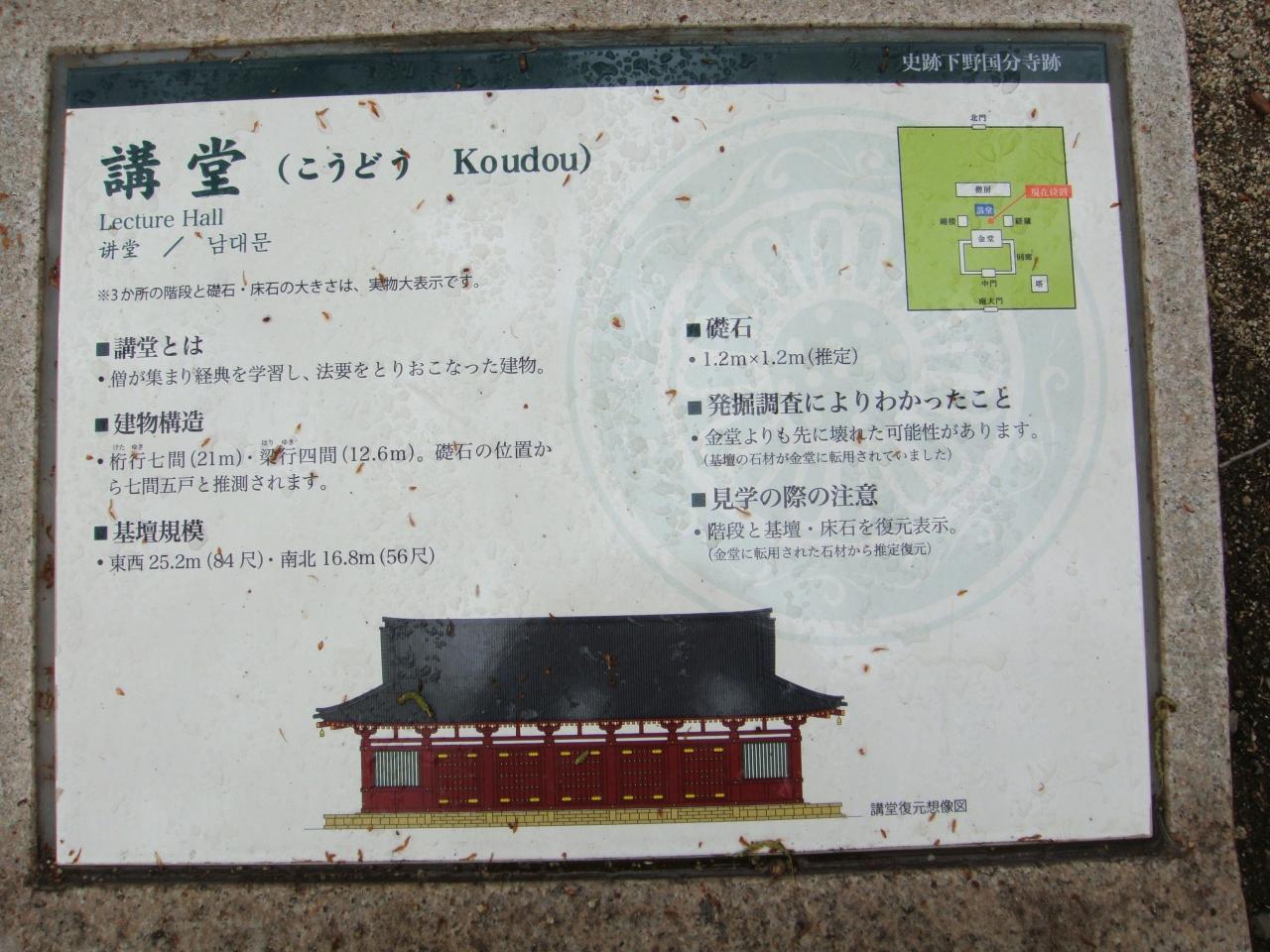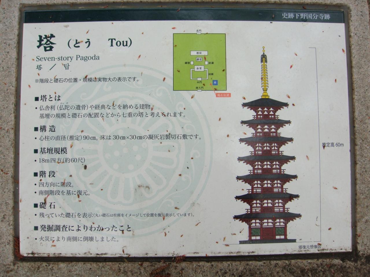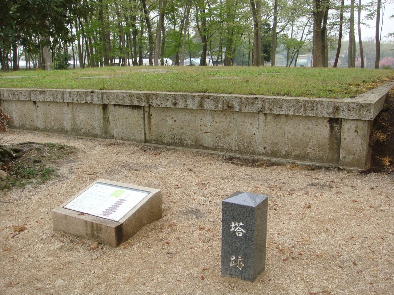 説明文概略です。塔 『基壇の規模と礎石の配置などから七重の塔と考えられます。心柱の直径(推定)90Cm、基壇規模18m四方(約60Cm)発掘調査により火災により南側に倒壊しました。』