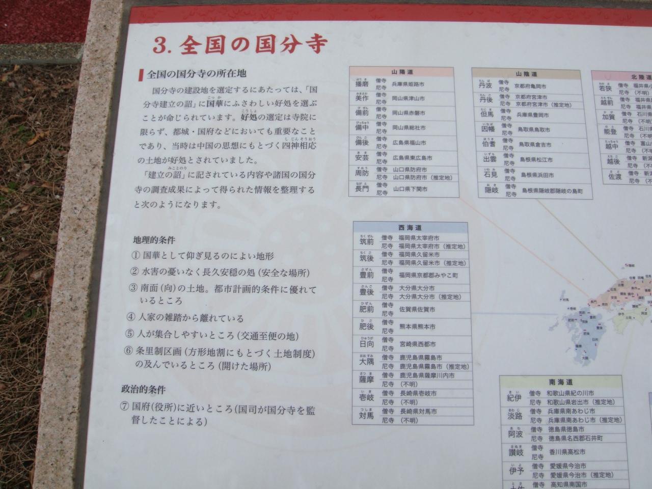 “国分寺(国分僧寺)”と“国分尼寺”は全国に約60数箇所、聖武天皇の詔(みことのり)によって建立されました。国分寺は、現代に例えると大学や研究機関のような役割のため、今のお寺のように一般の人のためにお葬式は行われず、個人のお墓もありませんでした。…説明文概略…“国分寺”と“尼寺”の建立目的は「飢餓や病気の流行、地震などの災害、貴族の対立や政治の混乱により社会に不安が広がったため、人々が豊かに暮らせるよう、さまざまな災いから国を守るよう祈るためでした。国分寺は正式名称「今光明四天王護国之寺(こんこうみょうしてんのうごこくんてら)」“国分尼寺”は「法華滅罪之寺(ほっけめつざいのてら)」といいます。