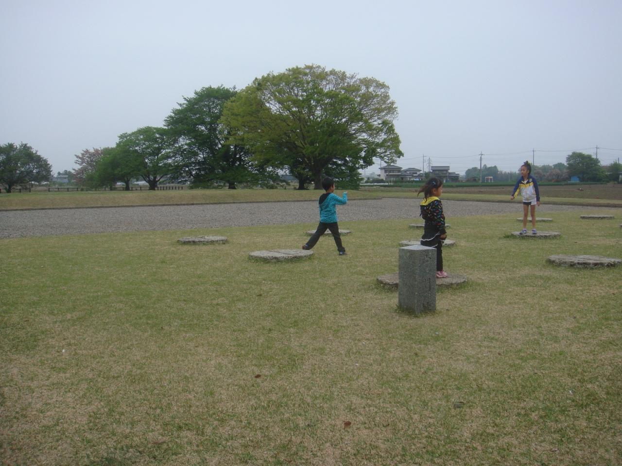 南門の柱の跡におばさんが立ちました。『間隔は6m、門の形は不明。柱の間隔が広すぎるので形がわかりません〔屋根のつかない冠木門(かぶきもん)の可能性あります〕建て替えは2回以上の掘り返しが確認されています。最終期は、直径30Cmの太さの柱使用。』と説明版に記されています。