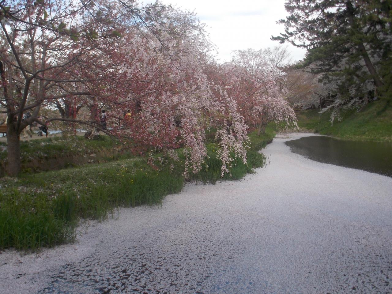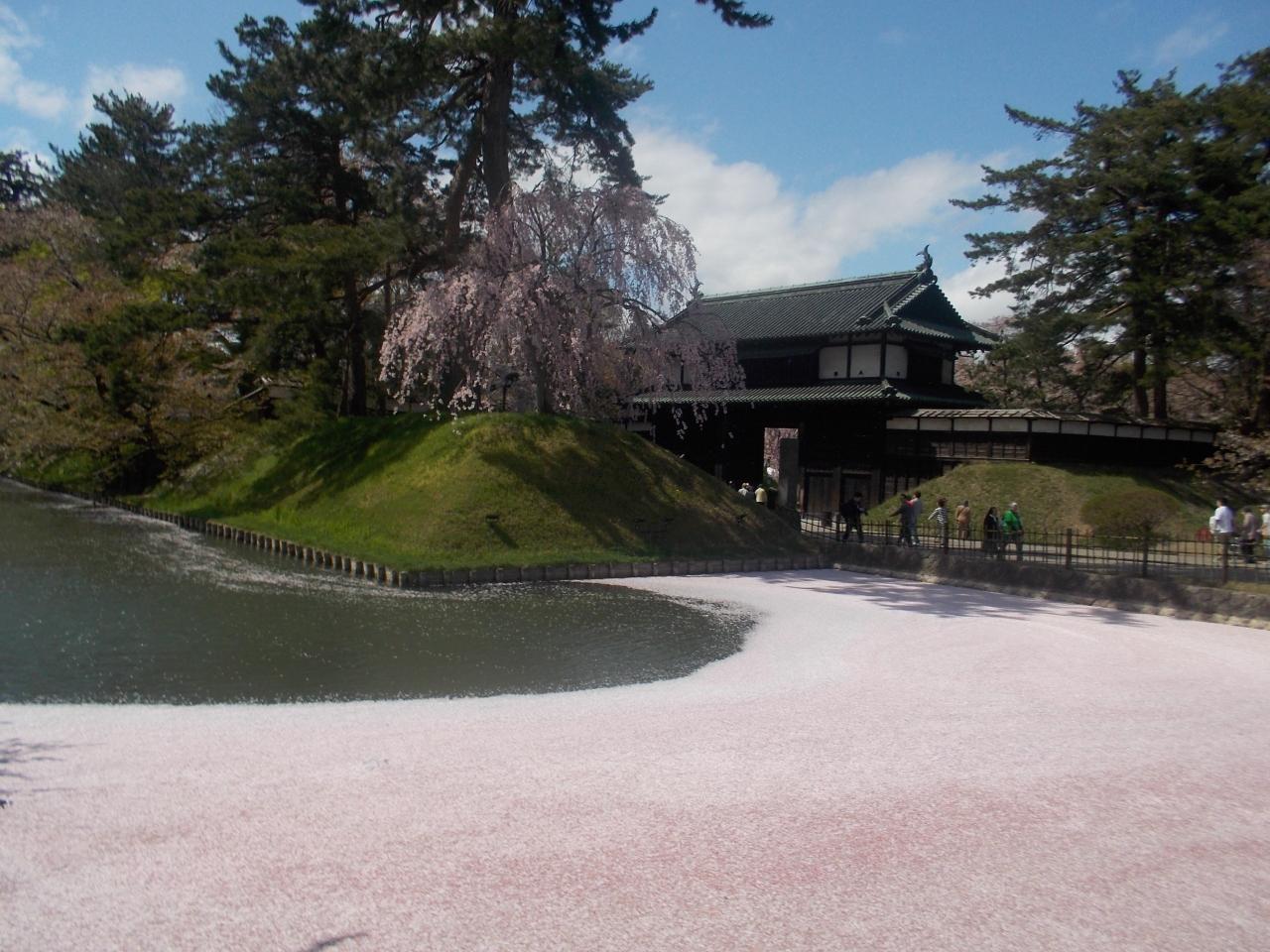 弘前城 追手門、 散った桜の花びらが、お堀の水面を覆っていました。