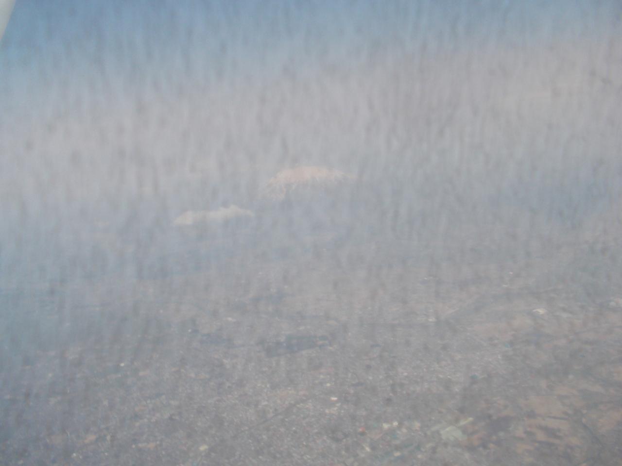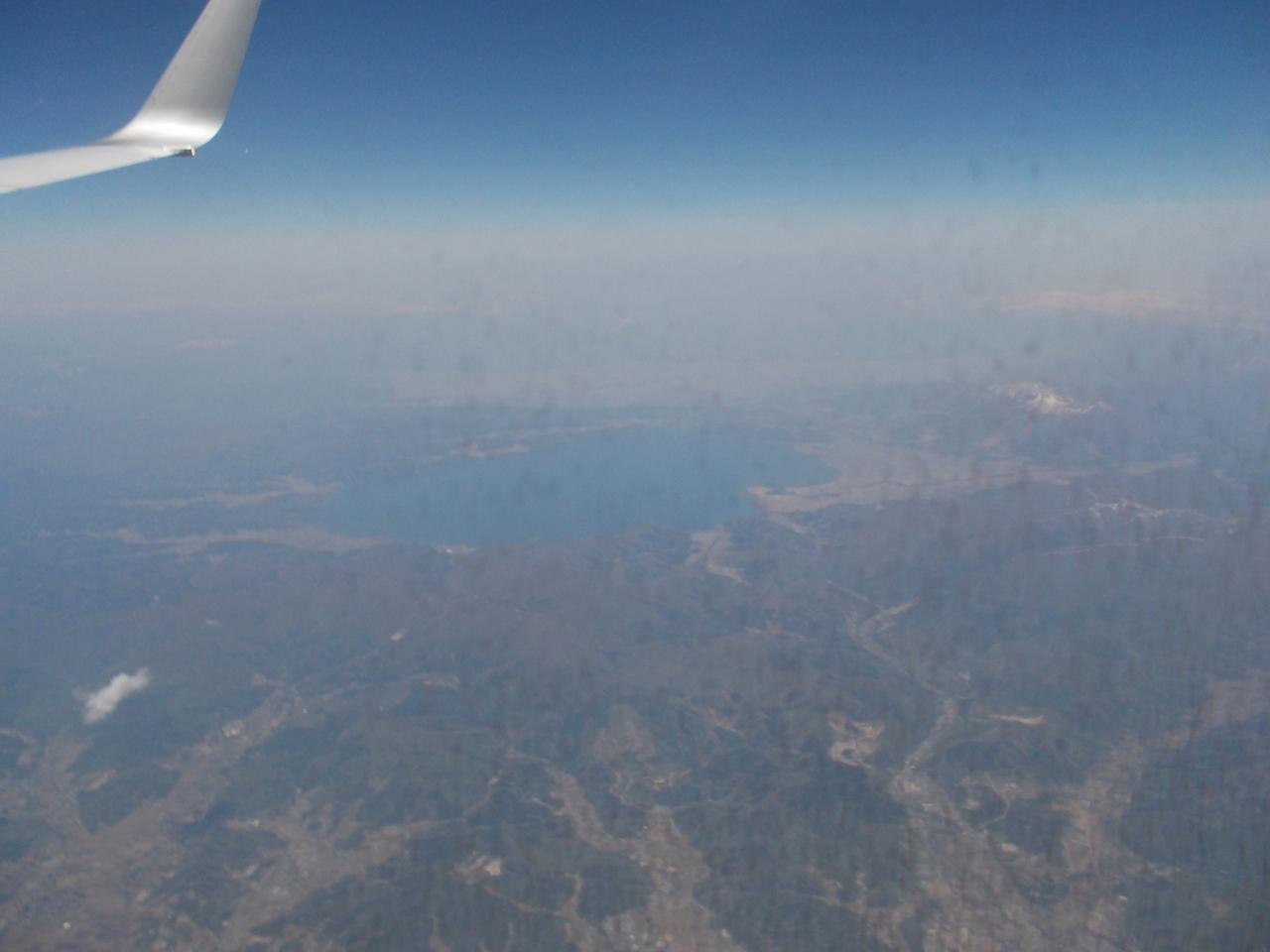 飛行機の窓から見える、猪苗代湖