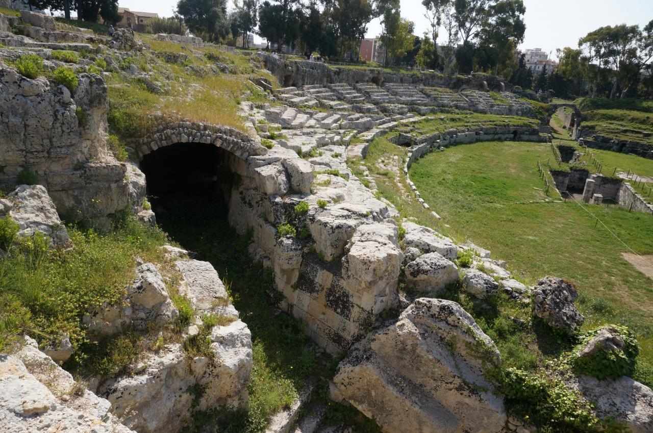 紀元前5世紀初期の建造で、その後、紀元前238年〜215年に僭主ヒエロン2世により、拡大改築された。直径が138mあり、15000人収容、シチリアで一番大きいギリシャ劇場です。
