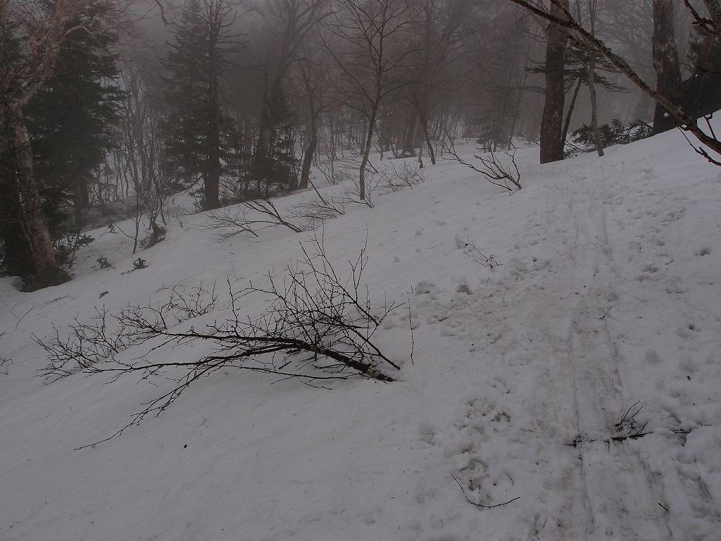 雪も硬く、無立木の斜面はスリップしたらはるか下の樹林まで止まらない……久しぶりに緊張しました、ピッケルを持って来れば良かった…… -