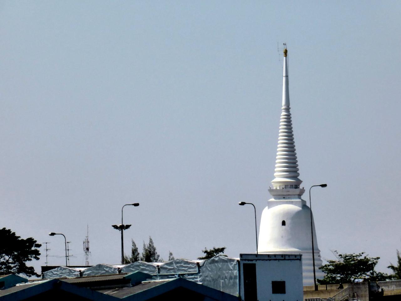 西側はかってバンコクの最初の都があった所で、今も景観の主体は昔ながらの面影を色濃く遺す仏塔群だが東側は仏塔群の背後にはいわゆるバンコクの現在の中心街。