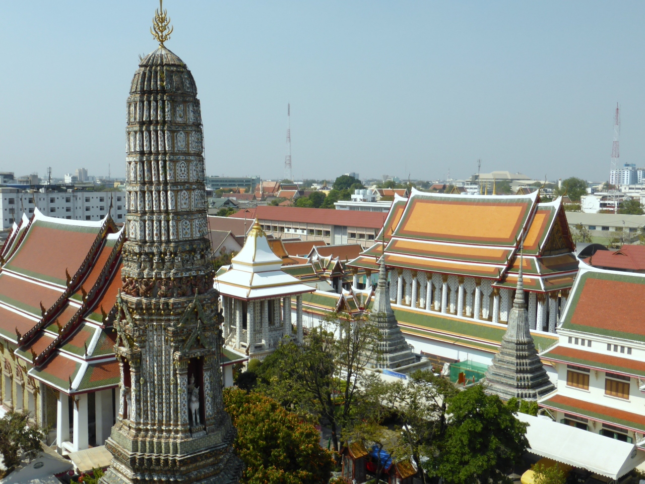 大仏塔の周囲には、中心の塔と同型の小仏塔が四方に配置され、その肩越しに遠方にはチャオプラヤー川を隔てて、川沿いには王宮を始め、美しい寺院の屋根の層と、その屋根越しに対称的なモダンなビル群が望める。