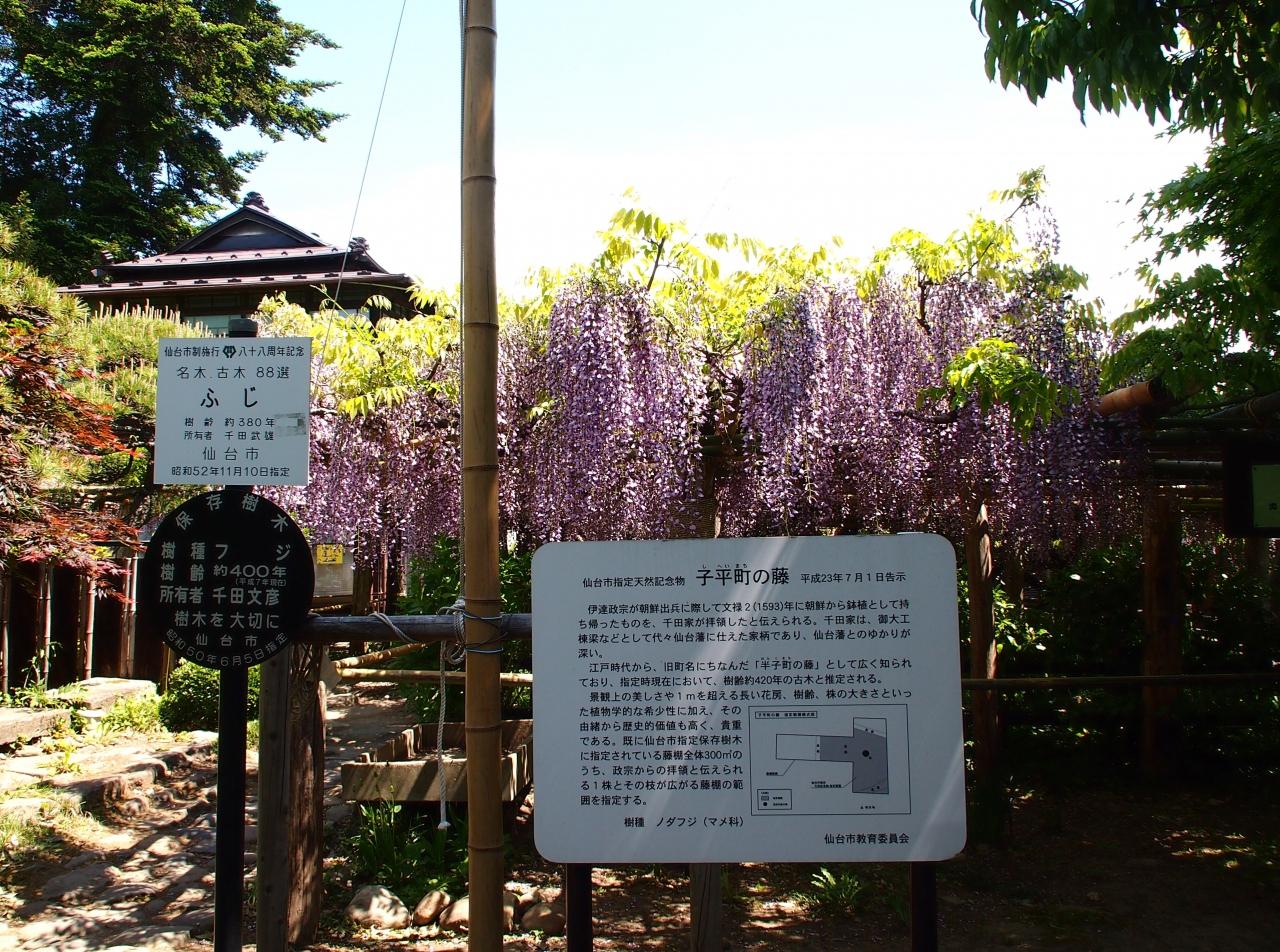 1593年、伊達政宗が朝鮮出兵した際、朝鮮から鉢植として持ち帰ったものを、仙台藩に代々御大工棟梁等として仕えた家柄の千田家が拝領した・・・と伝えられる「子平町(しへいまち)の藤」。