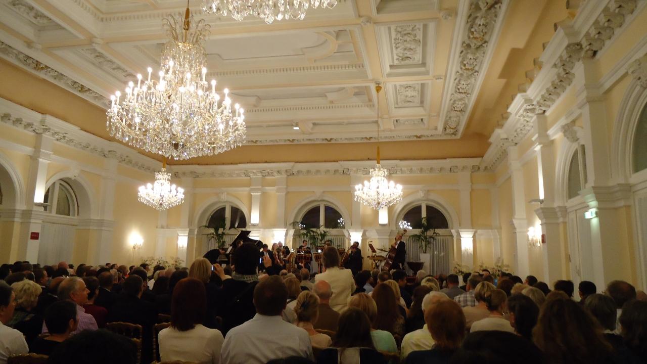 今夜はクアサロンでのコンサートを予約していました。ブラックスーツやドレスの老夫婦からカジュアルな観光客まで皆さんいろいろです。