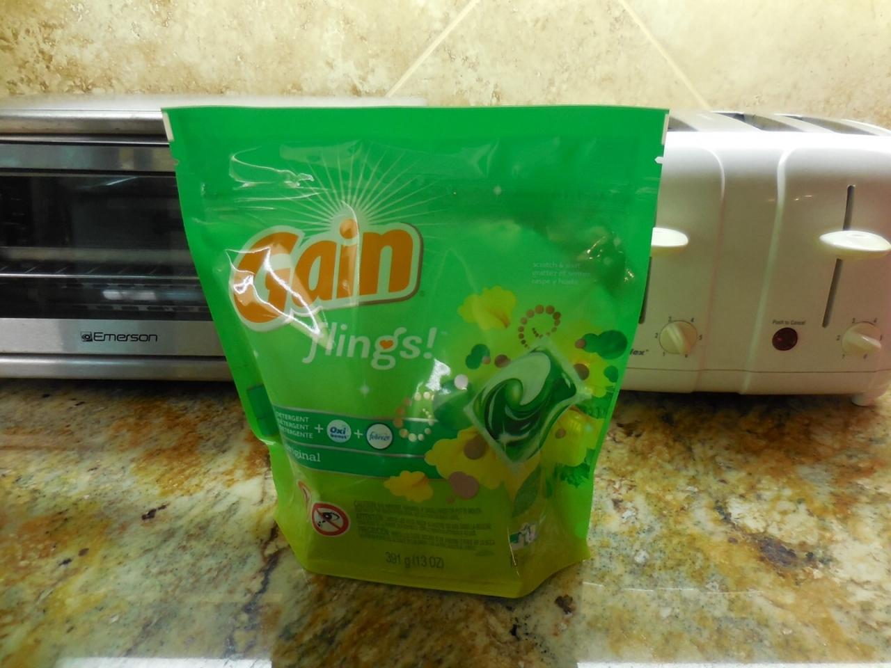 水で溶けるカプセル入りの液体洗剤。