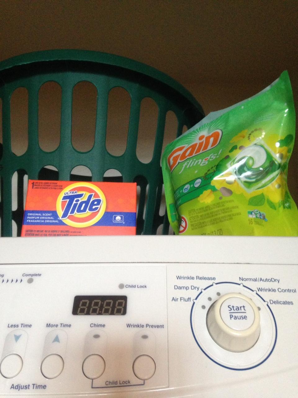 乾燥機の上には、備え付けの粉石けんの小箱が。
