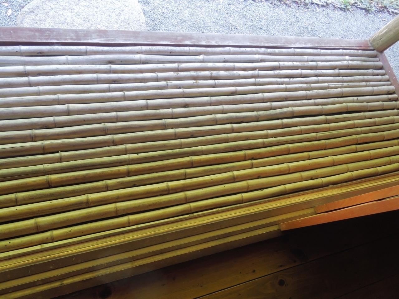 囲炉裏の間の縁側は青竹を敷き並べたもの。風がとおり、熱気がとばされて、なんとも涼しげでした。