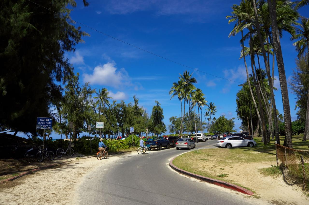 路肩に自転車を止め、カイルアビーチへ歩いて向かいます。