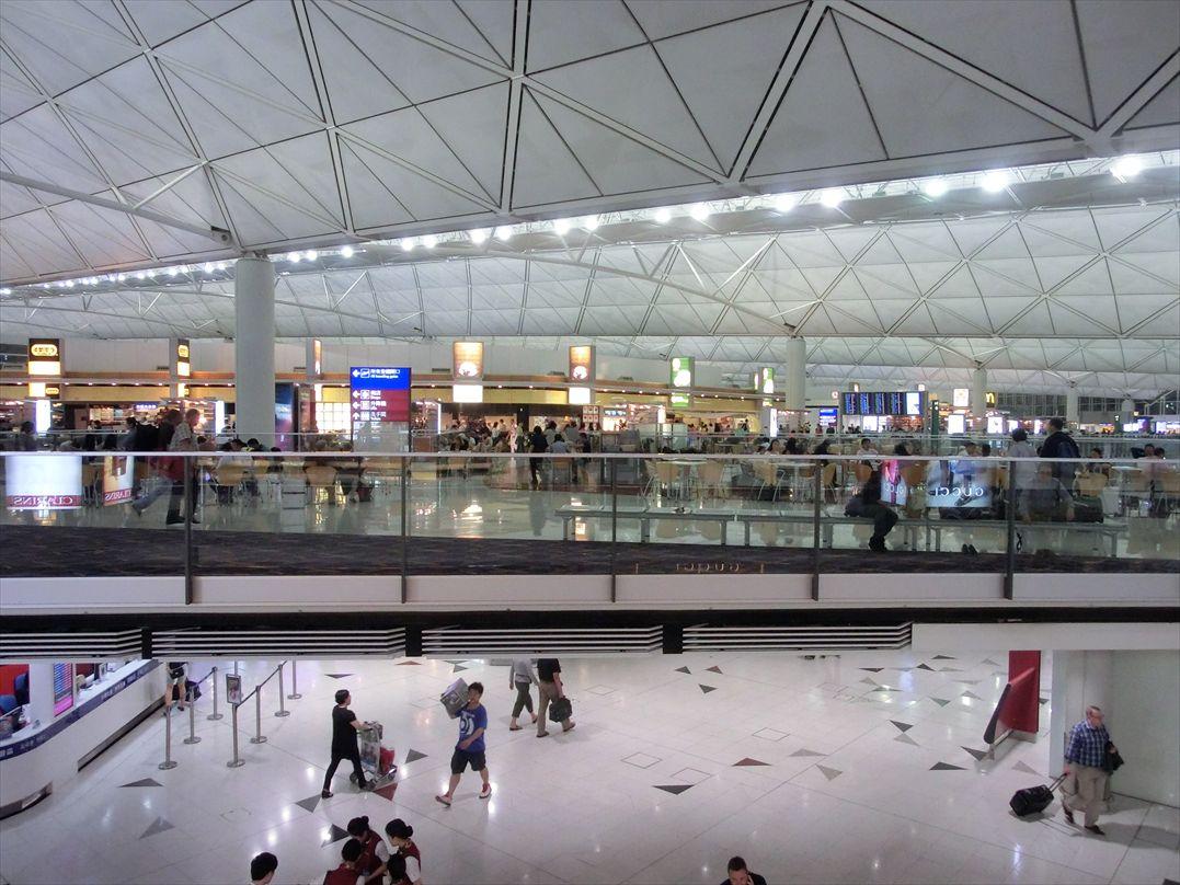 香港空港。トランジットの場合、先日と同じ所に上がって来ます。先に見えるのは先日使った1番ゲート。