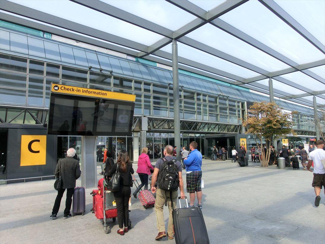 ヒースロー空港の出発口。地下道を出たところにターミナル案内がありました。