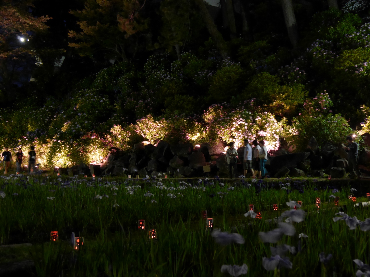 三脚を使って、菖蒲越しにライトアップされた紫陽花を撮っている人がけっこう多くいます。