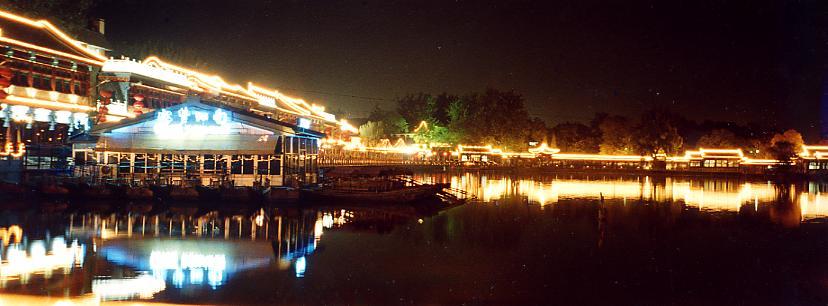 湖の周りに店が建ち並び、そのライトが湖面に反射して、シャッターを押さずにはいられなくなった。その結果がこの写真です。