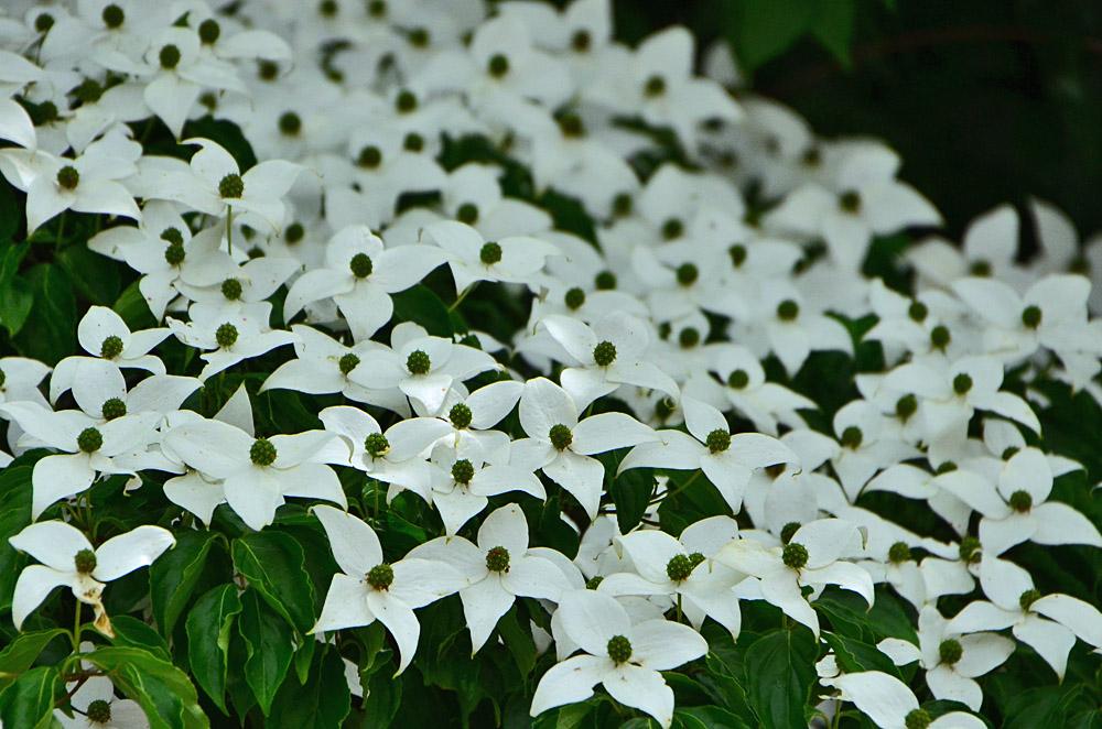 ヤマボウシは、緑いっぱいの中に梅雨の頃、