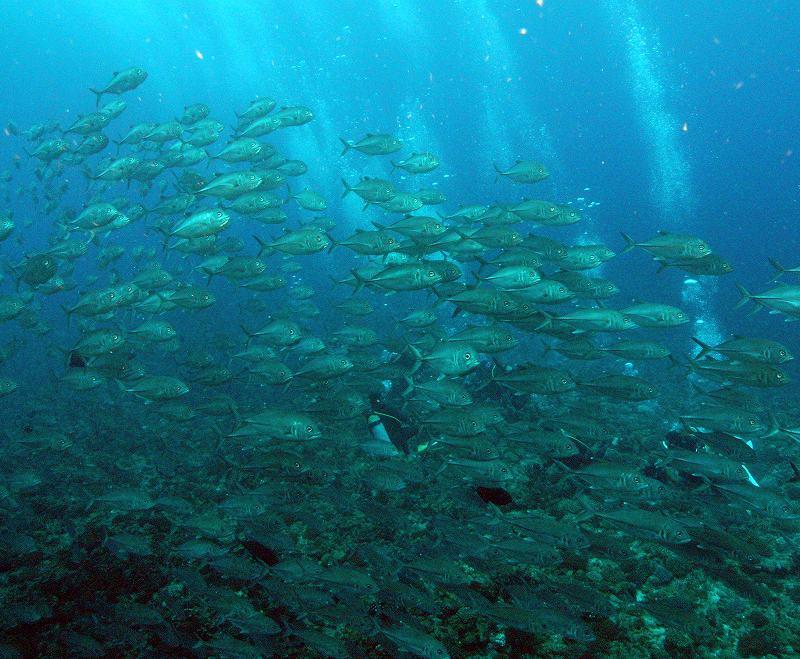 エルニーニョの影響か、梅雨が長引いています。そろそろ梅雨明けか・・・と思って出かけてきましたが、まだまだのようでした。島に入るときも雨雲のため第一航空粟国便は欠航の可能性もある・・・ということで心配しましたが、どうにか小雨でとどまり、到着できました。到着後5分後には雨脚が強まり、危ないところでした。一方、海の方は大潮でしたが波は高くなく、無理なく楽しめました。ギンガメアジは巨大な大群とは1回のみでしたが、1000匹程度の群れは常にいました。今回はイソマグロが多く、毎回100匹以上の群れがぐるぐる回遊していました。特に楽しかったのは、水深3mほどの根の上に200匹ぐらいが集まり、目の前を泳ぎ回ってくれたことで。ビデオで見ていただけるとその楽しさがよく伝わると思います。