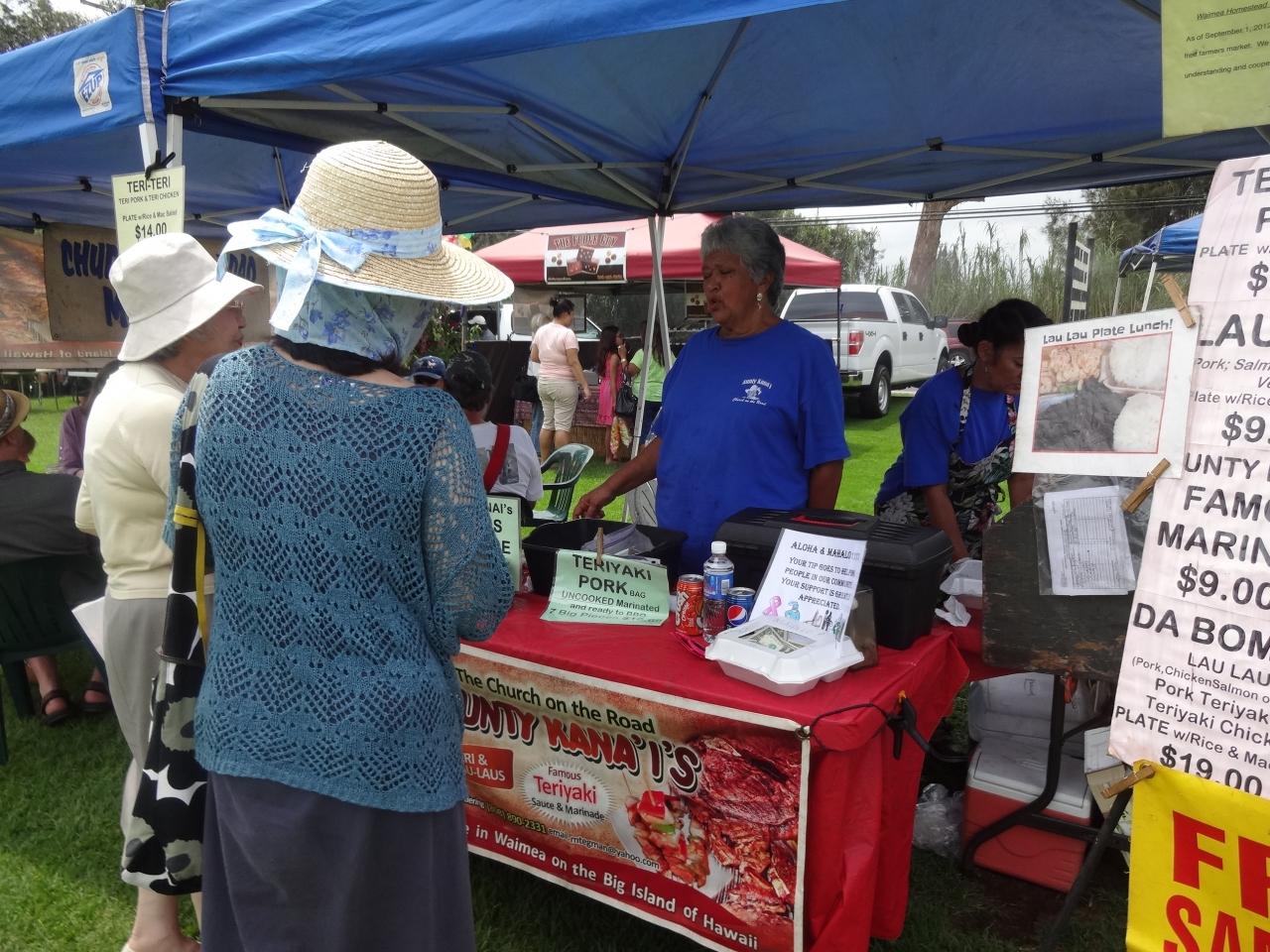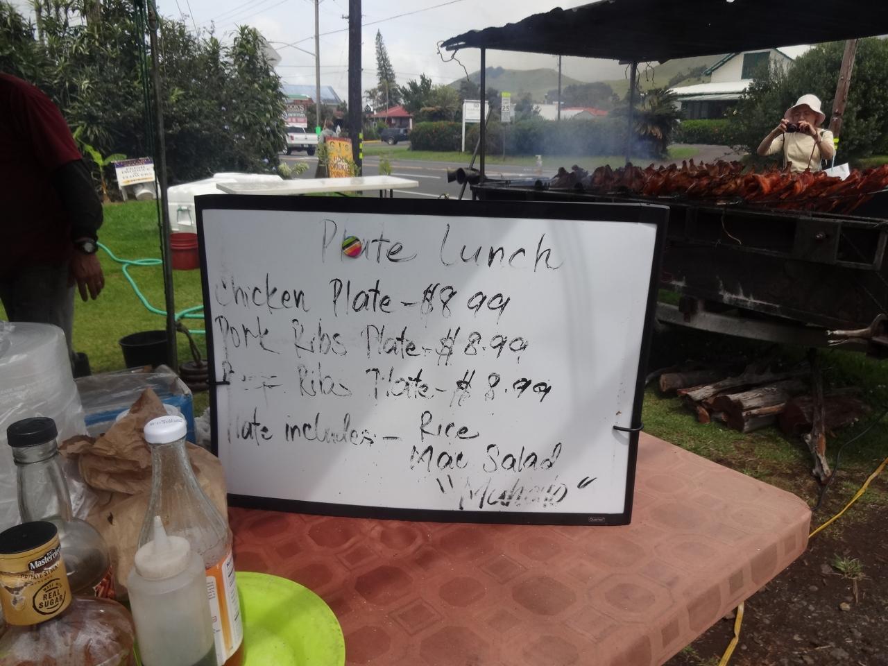 ワイメアの町で日曜日にフリフリがあると調べていたので、きょうは、ワイメアのファーマーズマーケットと合わせていきました。何人かのひとに尋ねながらたどりついたのは、ちょっと町外れのっ狭い空き地見たいとこる、19号線上です。近ずくと煙がモウモウ、すぐわかります。メニューはいろいろありました「
