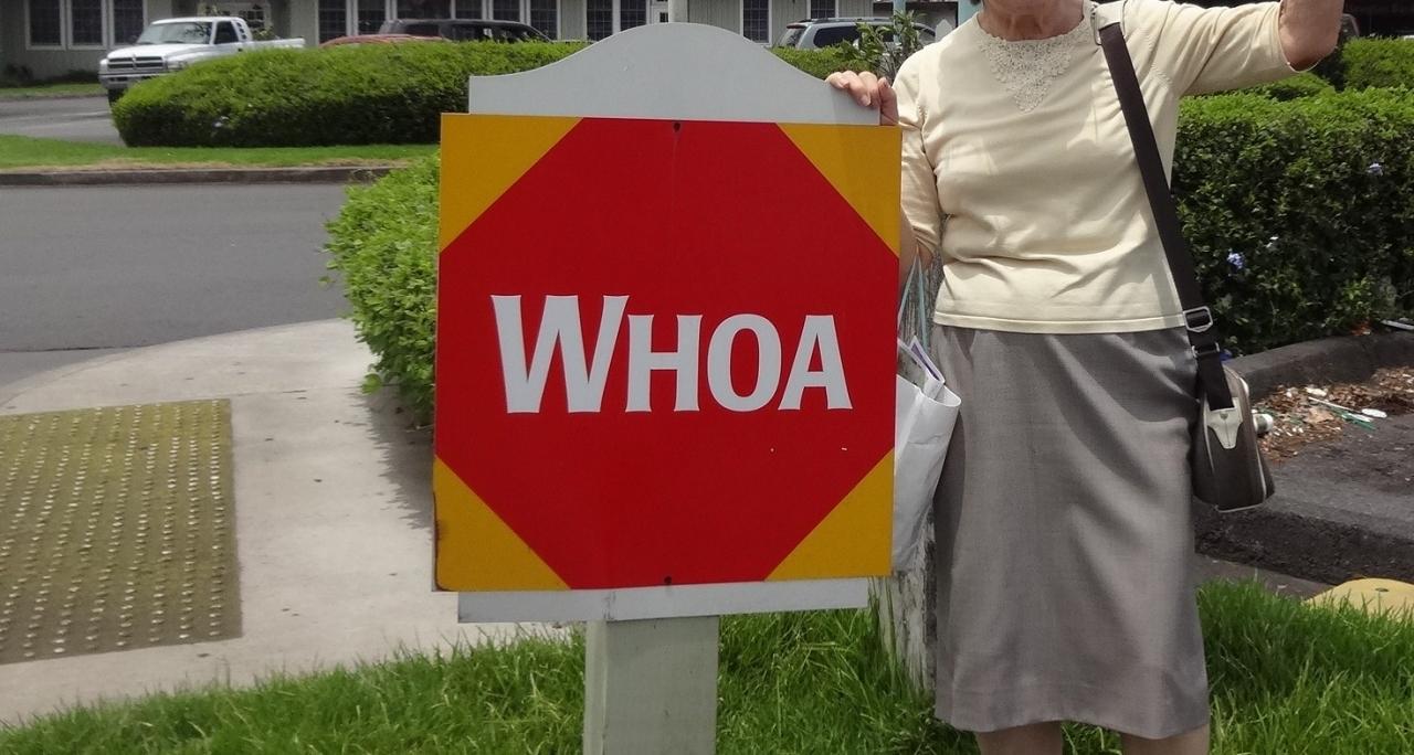 ここの一時停止はWHOAとかいてあります。カーボーイが馬を止める時の掛け声のようです?中ノショップでもシールがうってました。