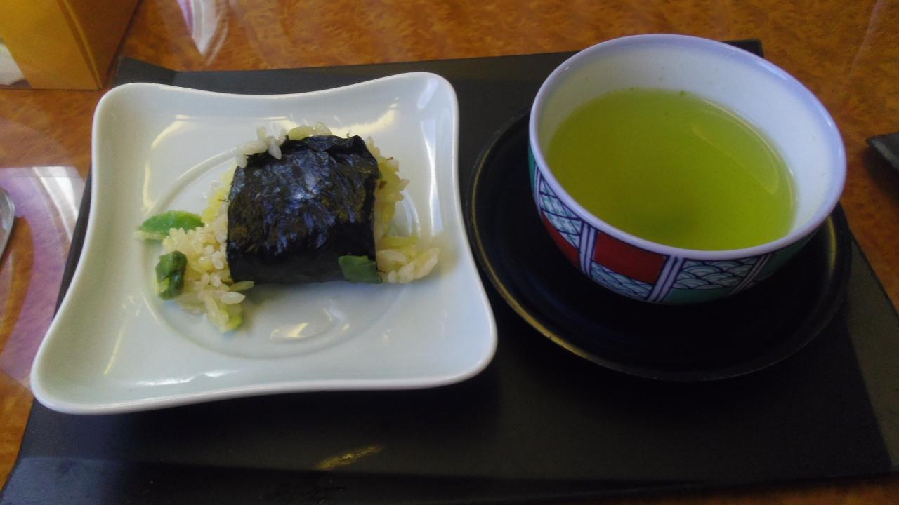 (食べかけですみません)山クラゲおにぎりとお茶でほっと一息。